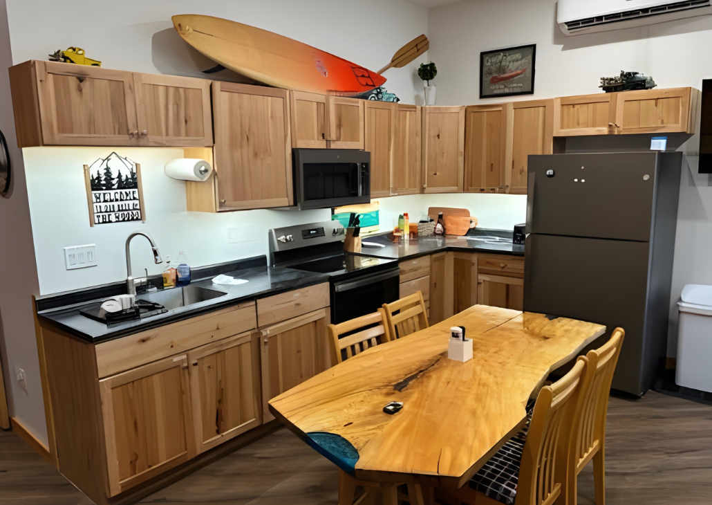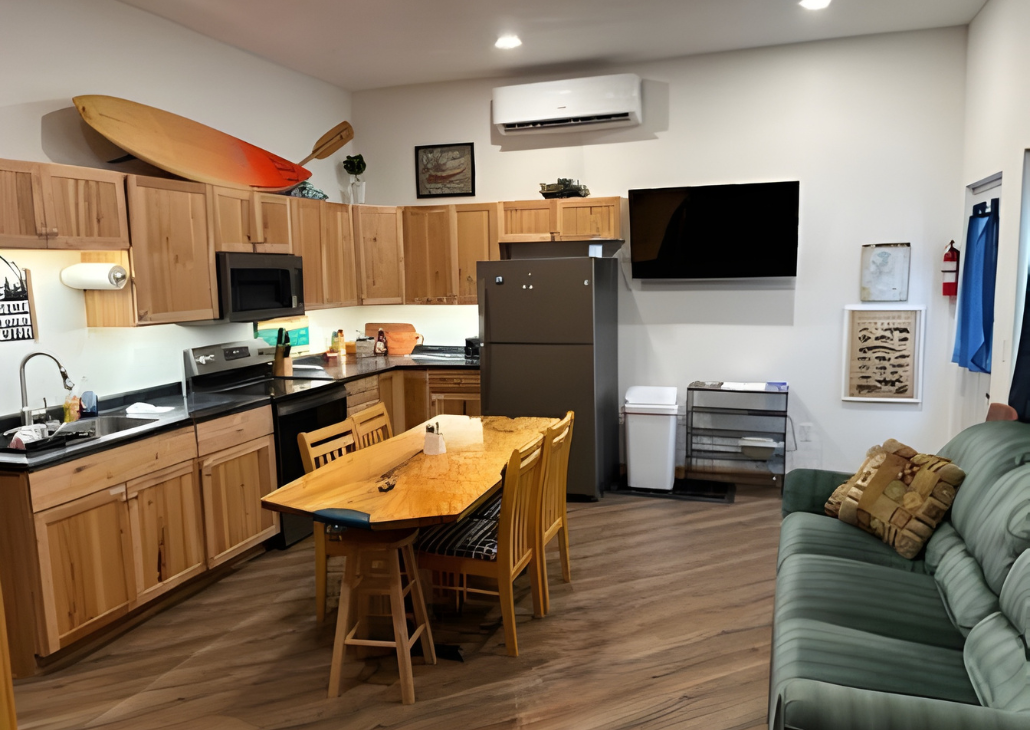 This unit features a full kitchen, open living space, and comfortable finishes throughout. Enjoy the natural beauty surrounding the property and gather outside around the fire pit for great conversation (guests provide wood).