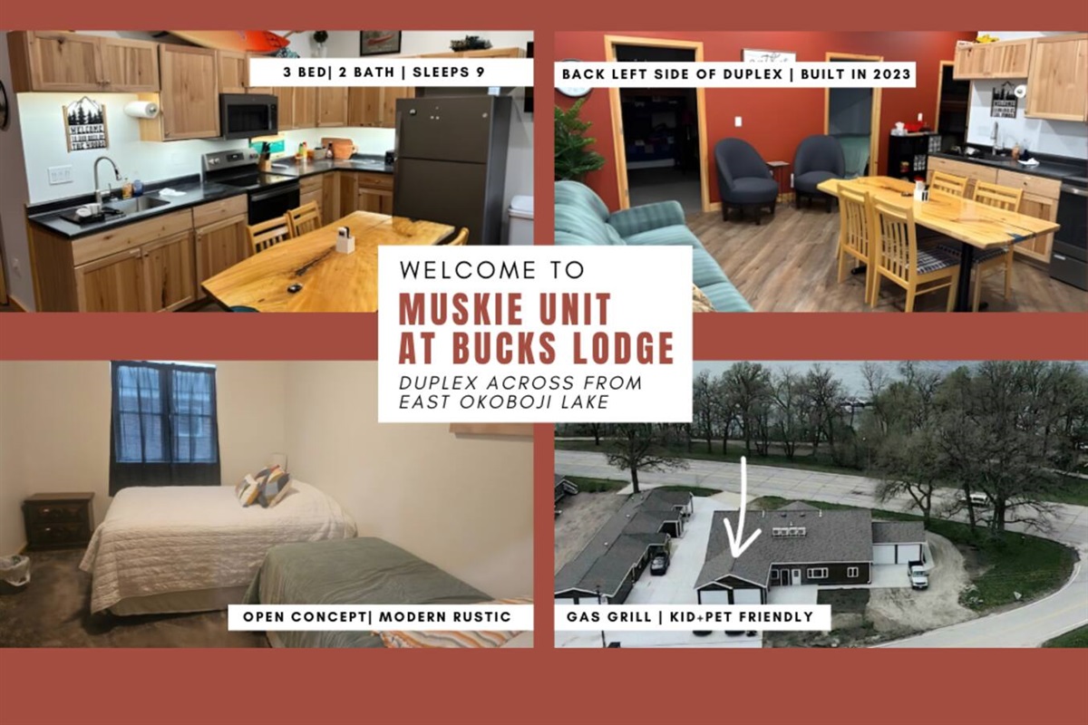 3 Bedrooms • 2 Bathrooms 2 Baths • Sleeps 1-9Welcome to Bucks Lodge – Muskie Unit, your serene Iowa Great Lakes getaway. This charming 3-bedroom, 2-bath retreat offers kid and pet friendly, modern comforts, and a fully stocked setup so you can simply arrive and relax.