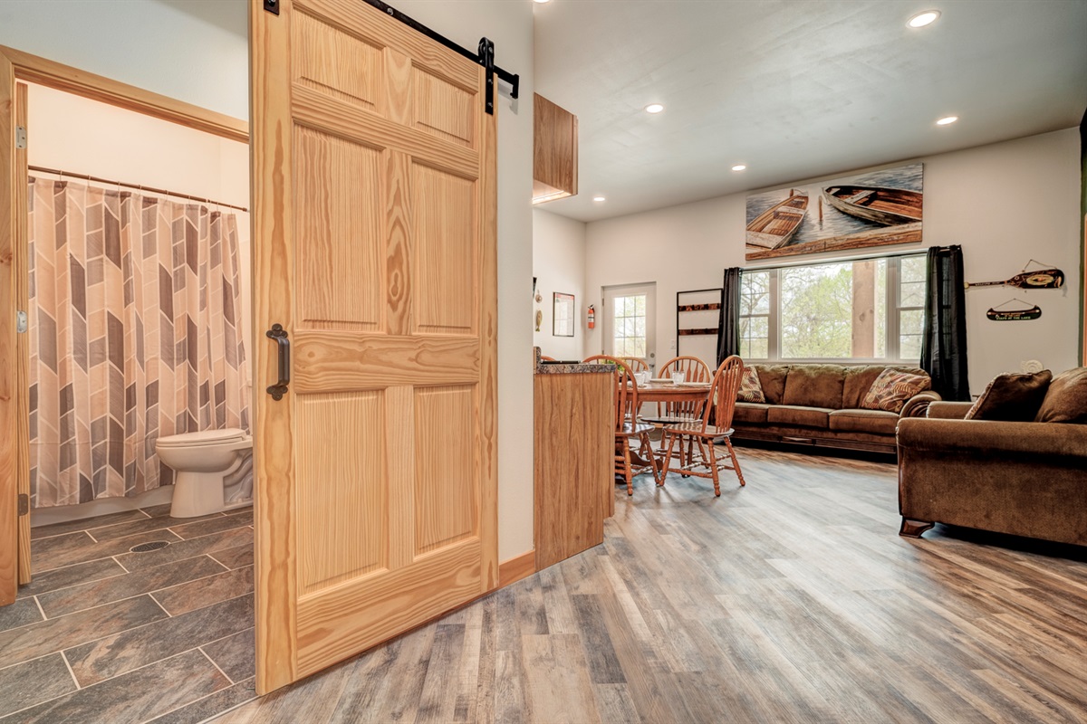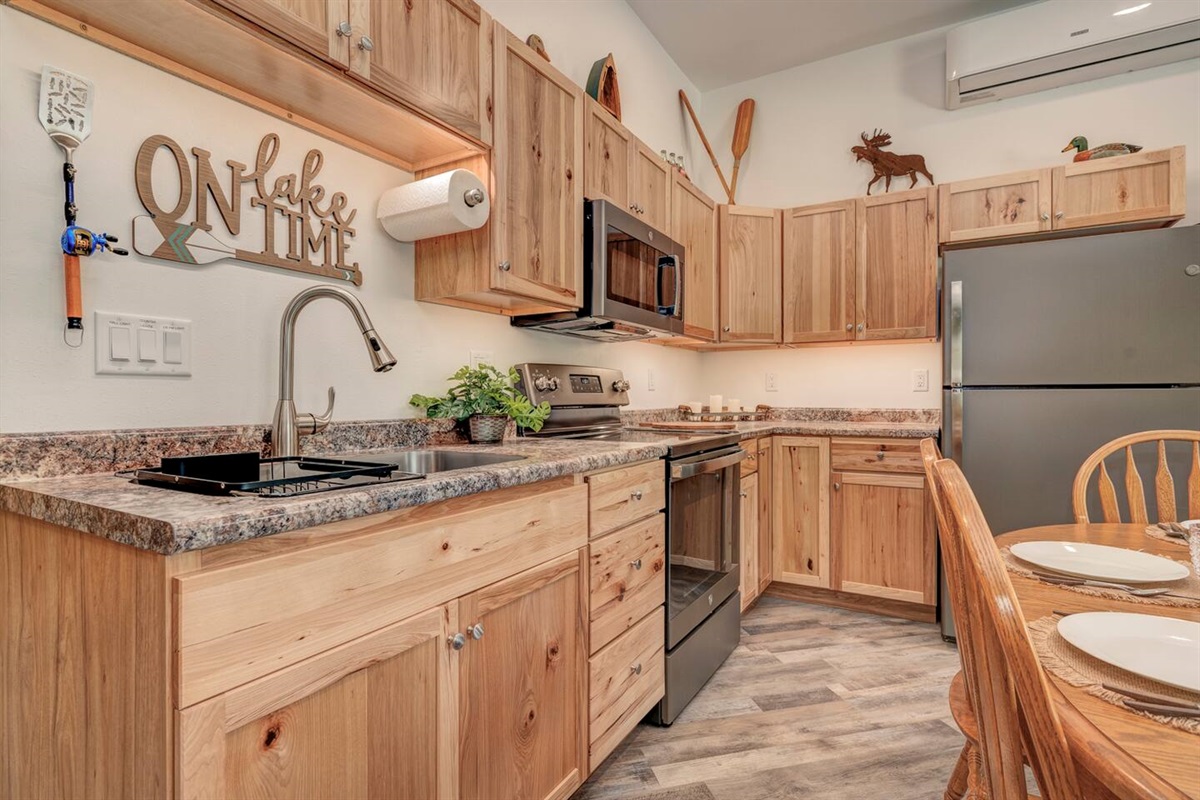This unit features a full kitchen, open living space, and comfortable finishes throughout. Enjoy the natural beauty surrounding the property and gather outside around the fire pit for great conversation (guests provide wood).